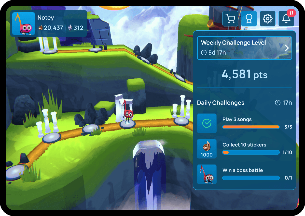 Notey's World adapts to your skill level and gives you challenges exactly when you're ready for them, and rewards you for seeking out additional levels of challenge. The game follows a carefully crafted curriculum but also takes your performance data and crafts supplemental levels to round out your understanding of topics.