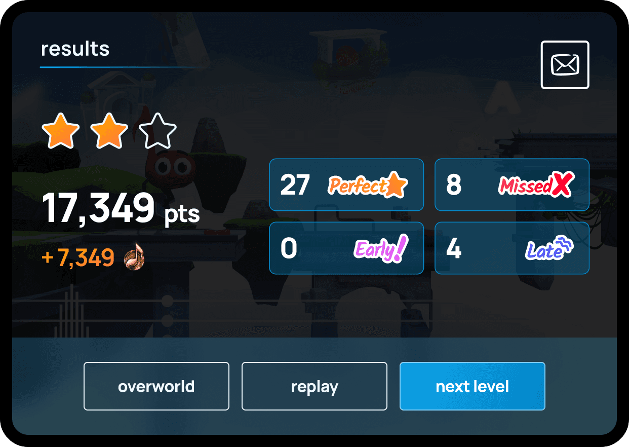 The music learning experience is gamified from the ground up in a way that students can follow and be engaged with at exactly their own pace. Sight reading exercises turn into platformer levels, and tests turn into boss fights, that combine technical skill development with engaging games that comfortably guide players through complex topics.